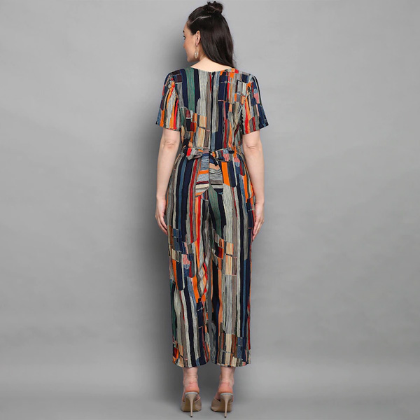 Blue and orange printed basic jumpsuit ,has a v-neck, short sleeves, 2 pockets